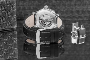 Jego elegancka, srebrna koperta idealnie komponuje się z głęboką czarno szarą tarczą, przyciągając spojrzenia subtelnymi refleksami światła oraz szczególną uwagę zwraca prześwit na tarczy, charakterystyczny dla stylu skeleton. Centralna część tarczy nie jest pełna – została ażurowo wycięta, dzięki czemu można obserwować pracę mechanizmu od frontu. Białe indeksy i wskazówki z biało srebrnymi akcentami dodają mu ponadczasowej klasy i zapewniają wyjątkową czytelność. Pasek wykonany z wysokiej jakości skóry w czarnym odcieniu, zszyty jasną nicią, co dodaje mu subtelnego charakteru vintage. Na pasku znajduje się tłoczone logo Zeppelin oraz napis, które podkreślają luksusowy i autentyczny charakter zegarka. Każdy element, od solidnej srebrnej sprzączki po stylową koronkę, został dopracowany, by stworzyć spójną i wyjątkową kompozycję.